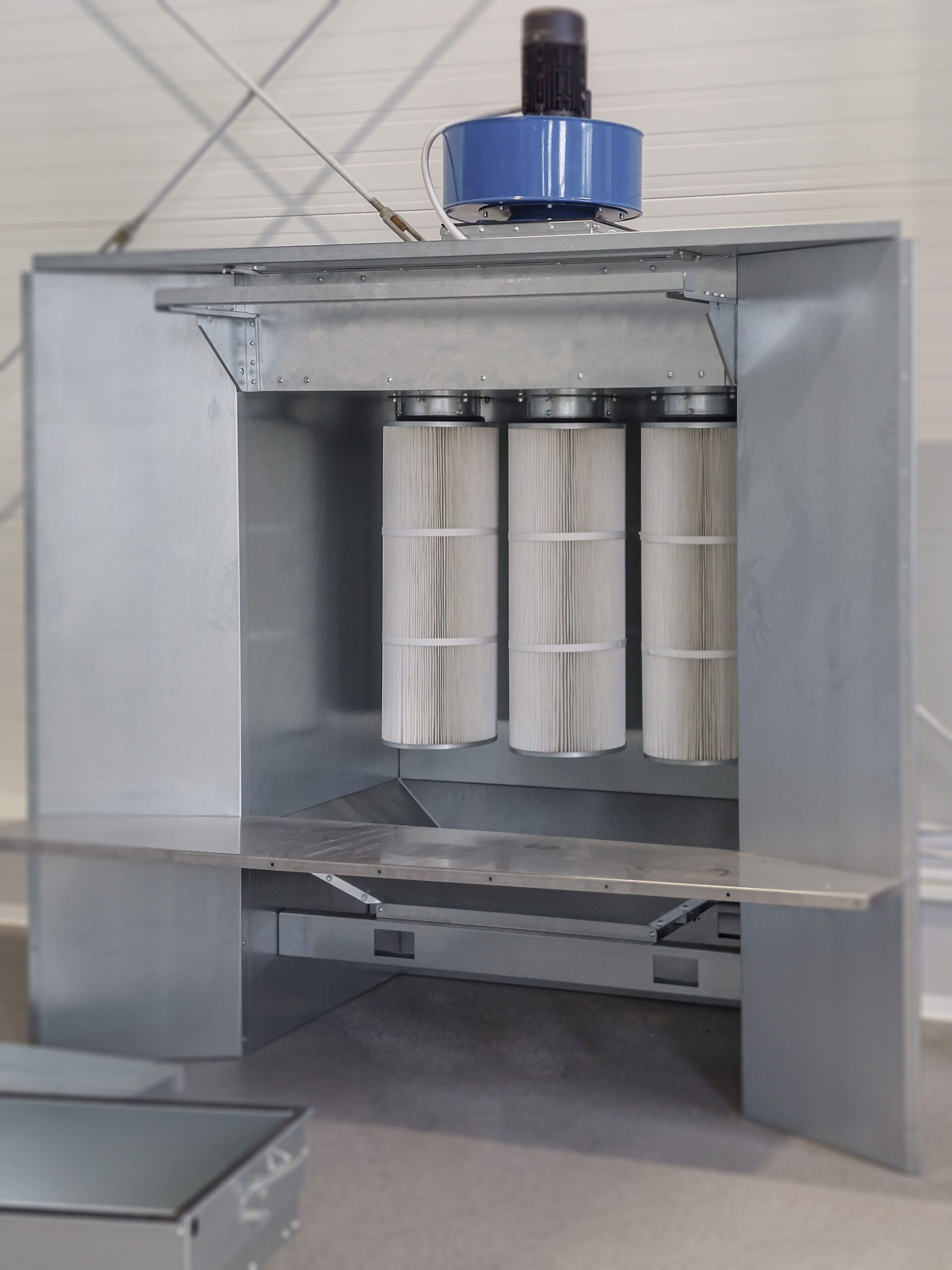 The Onyx unit helps maintain high production quality by removing airborne particles of coating materials. Thanks to the integrated cartridge filter, most solid contaminants – including powder coating dust – are captured and settle into the trough at the base of the painting wall.