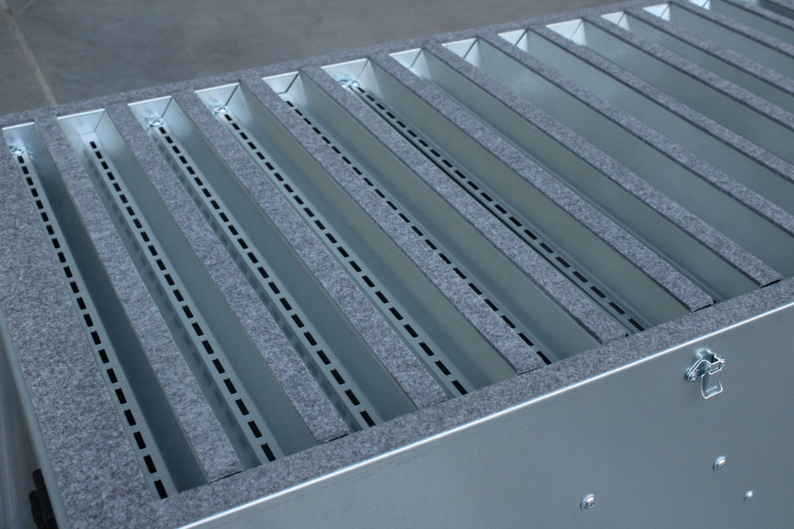 The system is built from 1×1 m modules, allowing adaptation to the room layout and production profile. For high variability of components, additional sections can be added as needed.